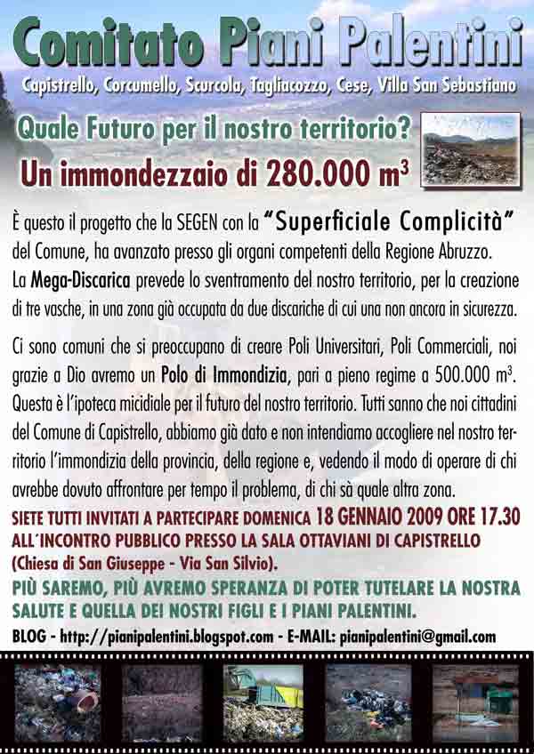 Il giorno 18 gennaio 2009 alle ore 17,30, presso la sala “Ottaviani” della Parrocchia S.Giuseppe di Capistrello (Via San Silvio), il neo “Comitato Piani Palentini” illustrerà ed approfondirà alcune tematiche inerenti il progetto di “Mega discarica” in località “Trasolero” (Corcumello di Capistrello), in fase di approvazione.