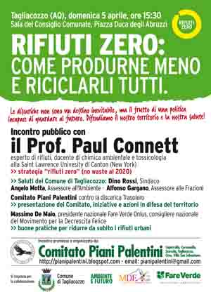 Nell’ambito degli incontri che il Comitato Piani Palentini sta organizzando per informare i cittadini e contrastare il progetto della SEGEN SpA della discarica “Trasolero” - attualmente fermo in sede di Valutazione di Impatto Ambientale alla regione Abruzzo - siamo lieti di comunicarvi che abbiamo in programma per il prossimo 5 APRILE 2009 ore 15,30 a Tagliacozzo (sala del consiglio comunale )un incontro sulla STRATREGIA RIFIUTI ZERO (ZERO WASTE 2020) che avra’ come primo relatore il Prof PAUL CONNETT del dipartimento di chimica della St. Lawrence University di Canton New York .